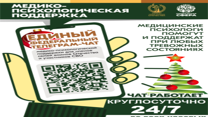 21 Января 2026 Единый федеральный чат Комитета семей воинов Отечества по оказанию медико-психологической поддержки семьям и участникам специальной военной операции (СВО) Продолжает свою работу единый федеральный чат Комитета семей воинов Отечества по оказанию медико-психологической поддержки семьям и участникам специальной военной операции (СВО) в круглосуточном режиме.   «Психологическая помощь часто нужна здесь и сейчас. Нам важно помочь каждому. В чате работает команда опытных высококвалифицированных медицинских психологов, которые оказывают бесплатные медико-психологические консультации по различным тревожным состояниям. Помощь оказывается в круглосуточном режиме, независимо от региона проживания. Важно то, что к нам можно обратиться анонимно, мы не требуем раскрывать персональные данные и это стало еще одним из дополнительных факторов востребованности именно такого формата психологической помощи, — отмечает руководитель Комитета семей воинов Отечества Юлия Белехова.    Сегодня запрос на цифровой формат общения, когда не надо идти к психологу. За год работы чата специалистами отработано более 22 000 индивидуальных обращений. Сегодня в динамике сопровождаются даже самые тяжелые случаи. В команде 60 клинических психологов из 10 регионов страны.   «В период предновогодних праздников ожидание перемен, праздничное настроение приводят, к сожалению, к традиционной «предпраздничной депрессии», являющейся достаточно серьёзной и комплексной проблемой, возникающей на фоне таких личностных и социально-психологических факторов, как: эмоциональное выгорание, развивающееся в ходе ожидания перемен и реализации задуманного; социально-психологический дискомфорт из-за финансовых проблем, вызванных большими предпраздничными расходами; внутренние страхи - необходимость начинать всё сначала «с чистого листа», «с нового квартала» будет активизировать психические срывы, агрессивное и суицидальное поведение.  В такие периоды психологическая поддержка становится наиболее актуальна. Наш чат помогает в дистанционном формате — это более доступная, востребованная и приближенная к заявителю поддержка, причем в режиме 24/7.», — комментирует координатор Чата, член Общественной палаты Российской Федерации и Московской области, руководитель федерального проекта «ЗдравКонтроль» Евгений Мартынов.   В чат уже подключилось более 18 000 человек из разных регионов страны.   Организаторы: Комитет семей воинов Отечества (КСВО) и Фонд «Социальная сфера» (команда федерального проекта «ЗдравКонтроль») при поддержке Общественной палаты Российской Федерации.   Будем рады вам помочь в Чате! https://t.me/+-NlCAoiZghk2OTNi
